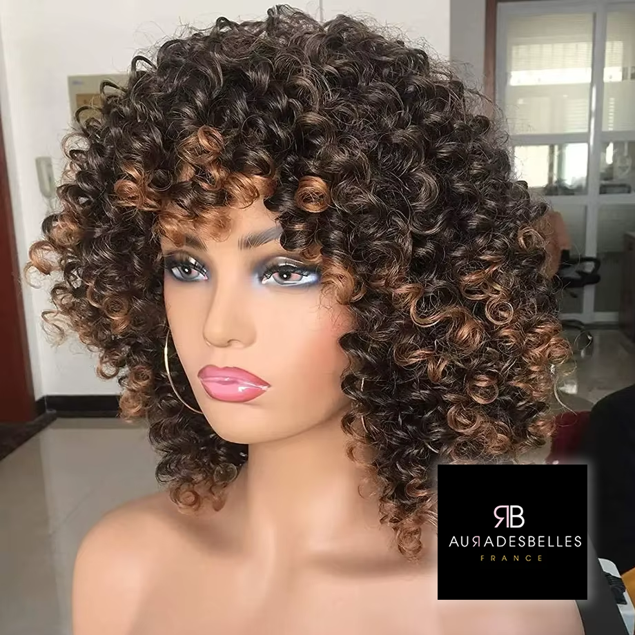 Perruque bouclée courte pour femmes avec frange et rebond naturel